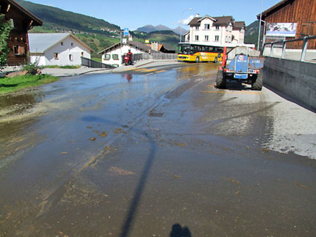 Die Jauche floss über eine Quartierstrasse und dann über die Hauptstrasse von Cunter GR. Ein Teil der Jauche gelangte in die Kanalisation, der grössere Teil jedoch in den Fluss Julia.