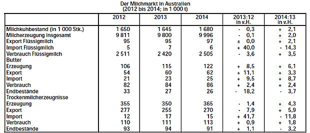 Die australischen Molkereiunternehmen werden 2014 voraussichtlich wieder mehr Milch verarbeiten können. Einer aktuellen Marktanalyse von Agrarexperten der US-Botschaft zufolge soll die Produktion im nächsten Jahr auf fast 10 Millionen Tonnen steigen, das wären fast 200'000 Tonnen oder 2 Prozent mehr als 2013.