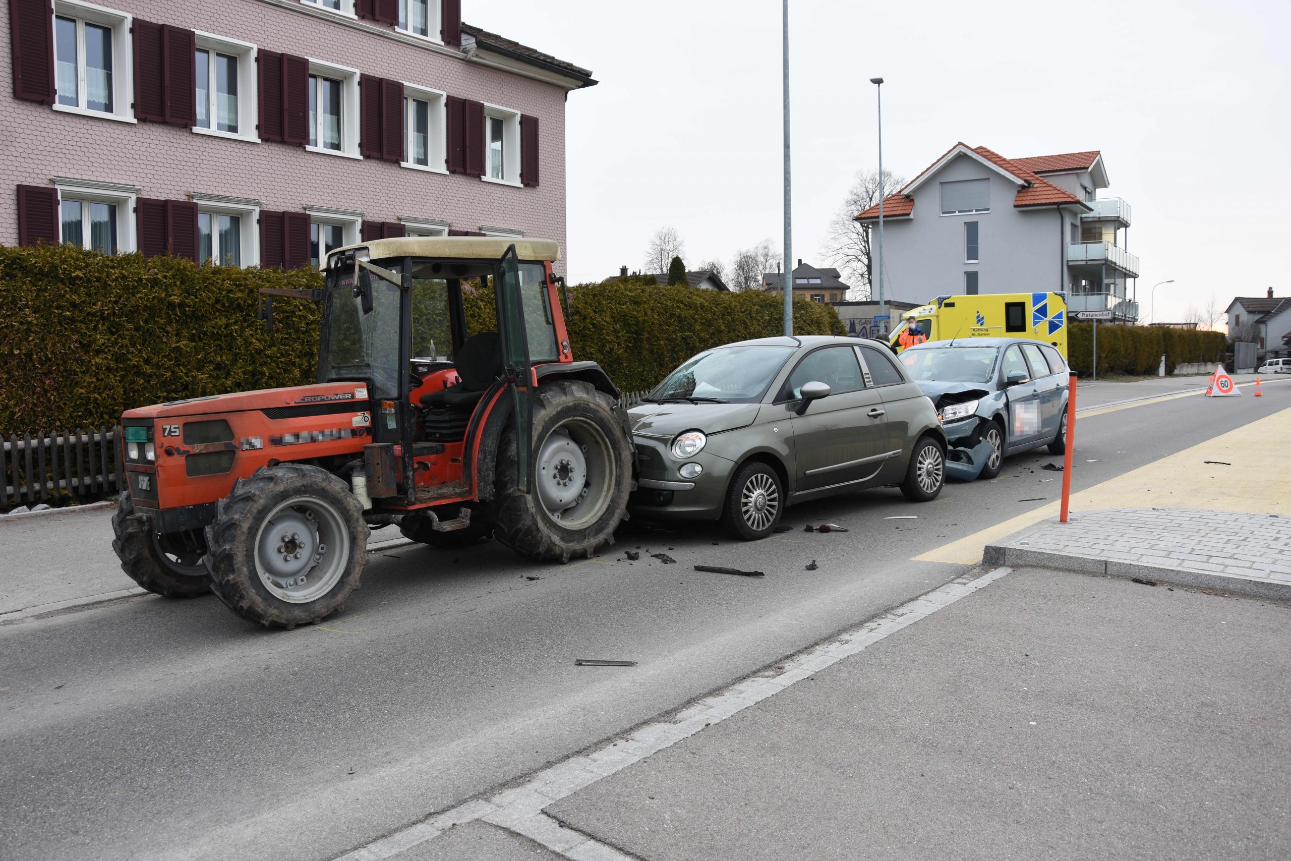 Hinter dem Traktor war ein Auto unterwegs. Die Lenkerin hielt ihren Wagen an. Doch der zuhinterst fahrende 20-Jährige bemerkte das Anhalten zu spät. Er stiess ungebremst mit dem Heck des Autos der Lenkerin zusammen.
