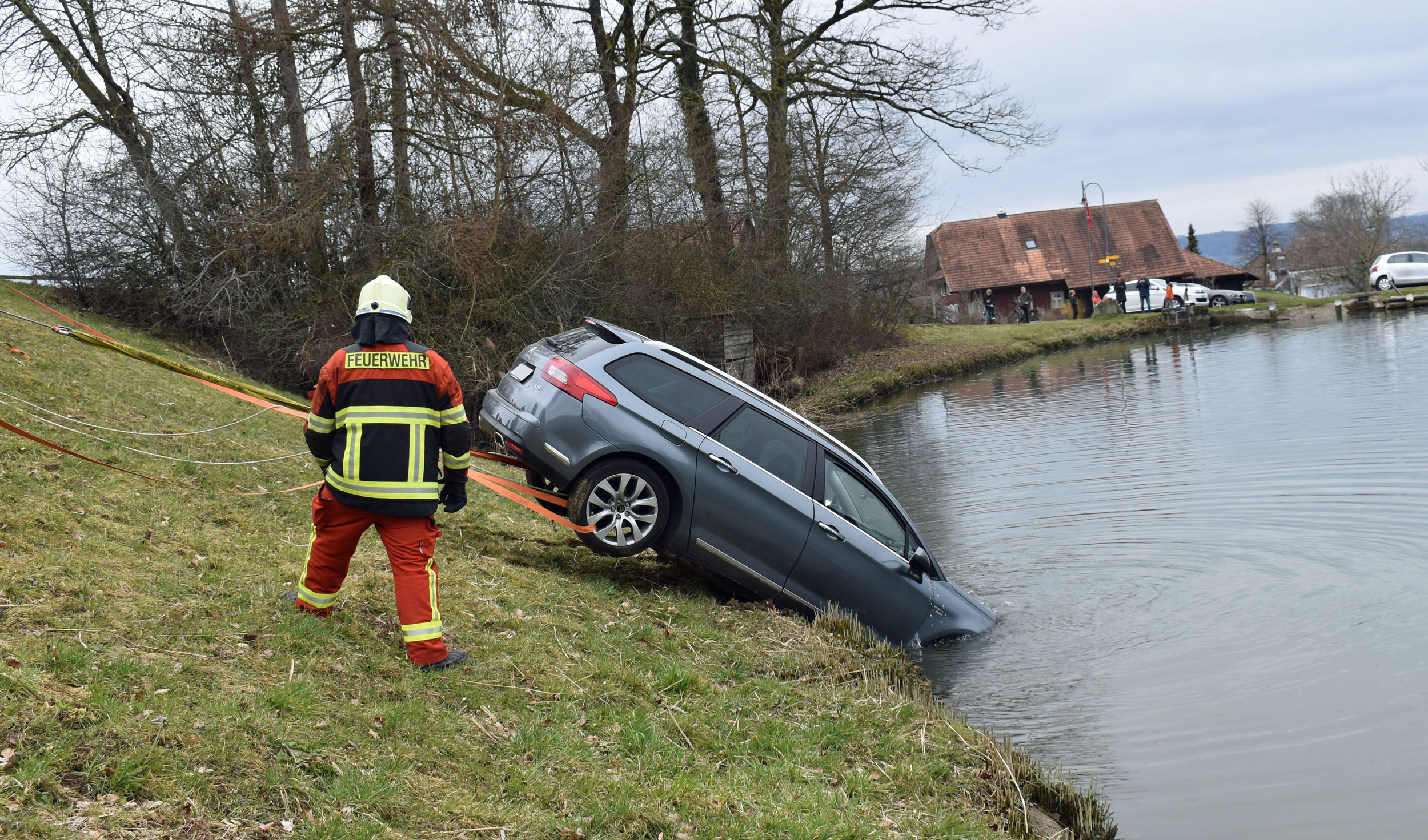 Der 45-Jährige konnte sich selbständig aus dem Auto befreien. Er blieb unverletzt. Die Feuerwehr barg das Auto mit einer Seilwinde aus dem Weiher.