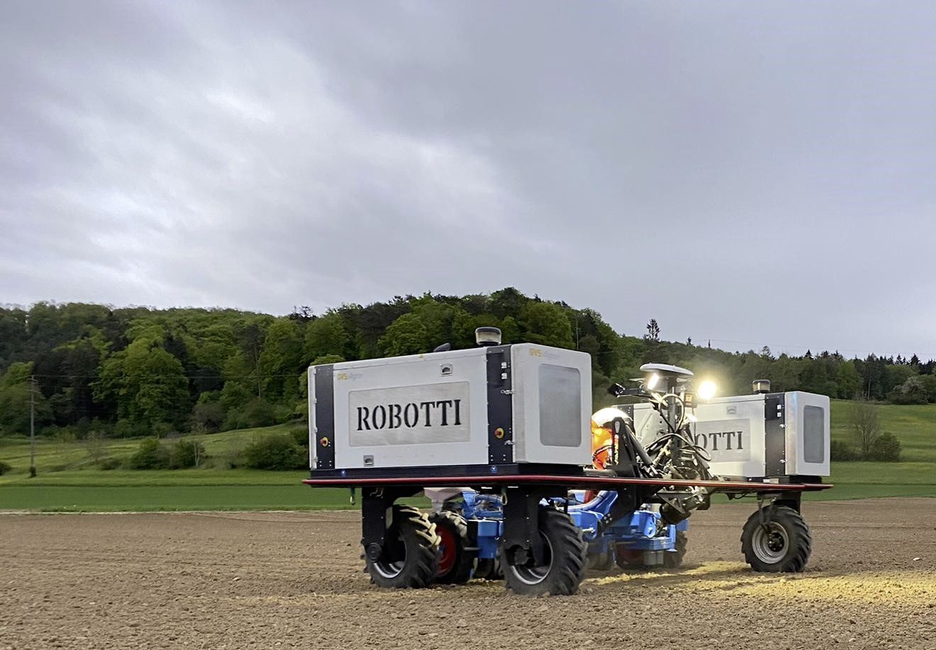 Autonom funktioniert ein mit Sensoren ausgestatteter «Werkzeugträger», der mit unterschiedlichen Geräten ausgerüstet bei der Feldarbeit eingesetzt werden kann. Der «Robotti» scannt seine Umgebung und würde bei einem Hindernis anhalten. Er muss trotzdem überwacht werden, beispielsweise via Laptop.