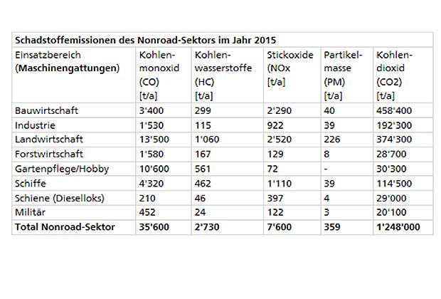 Gemäss einer am Mittwoch veröffentlichten Studie des Bundesamtes für Umwelt (BAFU) stossen Maschinen und Geräte aus dem Non-road-Sektor jährlich rund 500 Tonnen Partikel, 10'000 Tonnen Stickoxide und 1,2 Millionen Tonnen CO2 aus. Das ist überproportional viel, wie der Bericht aufzeigt: Obwohl der nicht-Strassen-Sekor nur neun Prozent der gesamten Energie verbraucht, ist er für 20 bis 32 Prozent des Schadstoffausstosses verantwortlich.