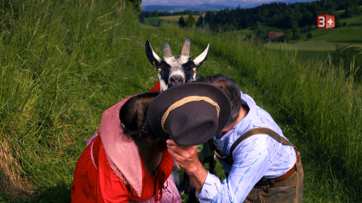 Peter (62, LU) gerät ins Staunen, als Brigitte (58, BL) in ihrer roten Heidi-Tracht vor ihm steht. Beim Fotoshooting als Geissen-Peter und Heidi legt der sonst so zurückhaltende Bauer seine Scheu Schritt für Schritt ab – bis es am Ende zum Kuss kommt: für Ziege Diana oder doch für Brigitte?