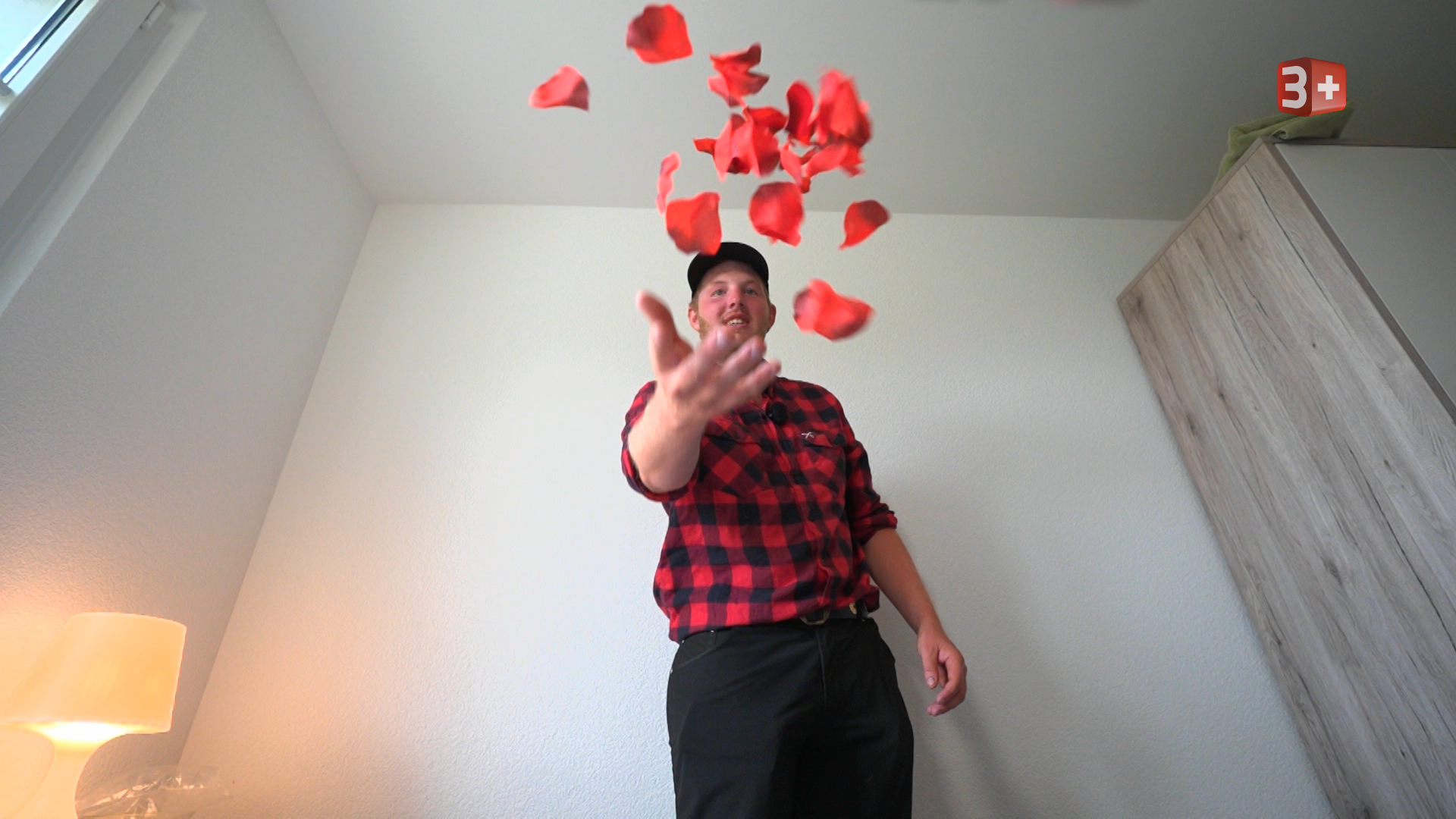 Der Jungbauer Sämi hats faustdick hinter den Ohren – und zweideutige Gedanken inklusive. Doch er ist auch sichtlich bemüht, dass sich Jasmin bei ihm wohlfühlt. Das Schoggiherz geht unter den vielen Rosenblättern fast verloren und verrät: Da ist jemand nervös!