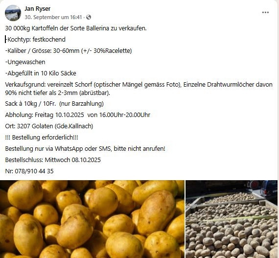 Angefangen hat alles am 30. September 2025. Da postete der Landwirt Jan Ryser aus Golaten BE in der Facebook-Gruppe «Rettet die Ernte vor dem Müll», dass er 30'000 Kilo Kartoffeln der Sorte Ballerina zu verkaufen habe.