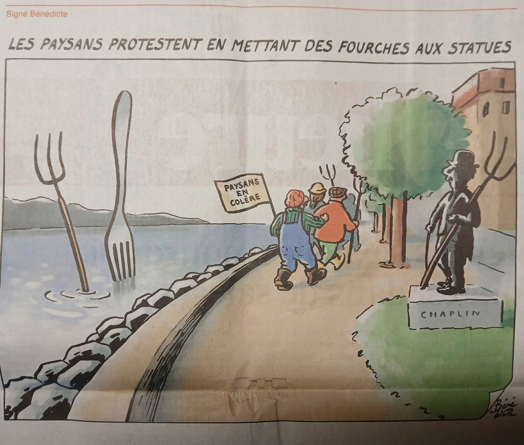 Arnaud Rochat fordert seine Berufskolleginnen und Berufskollegen dazu auf, Heu- und Mistgabeln an Kreiseln und Denkmälern anzubringen.
