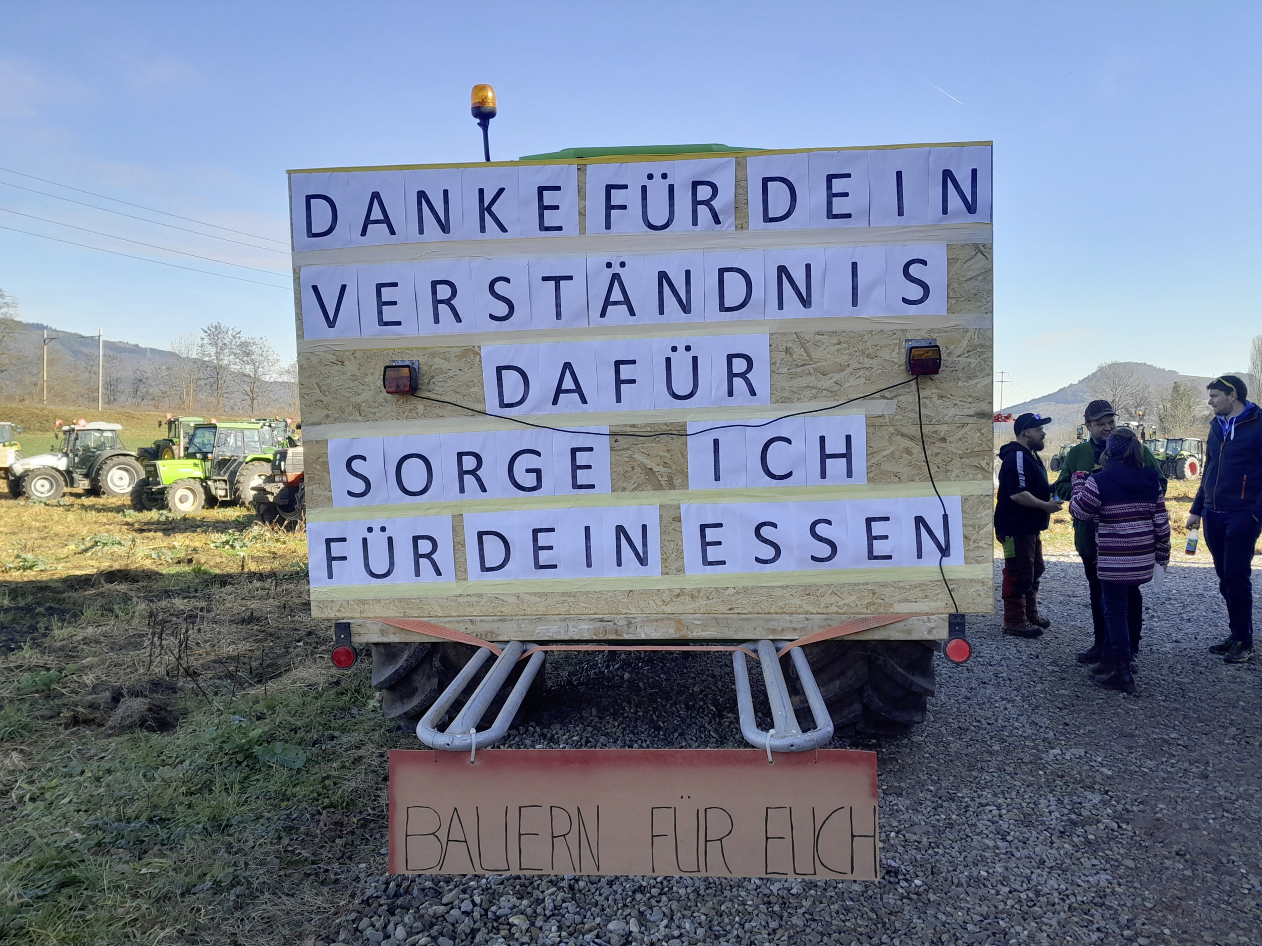 Über Rheinfelden AG und Möhlin AG kam der Umzug auf einem Feld mit abgefrorener Gründüngung bei Waldbach AG schliesslich zum Stillstand. Dort formierten die Landwirtinnen mit ihren Traktoren die Buchstaben BFE, was so viel heisst wie «Bauern für Euch».