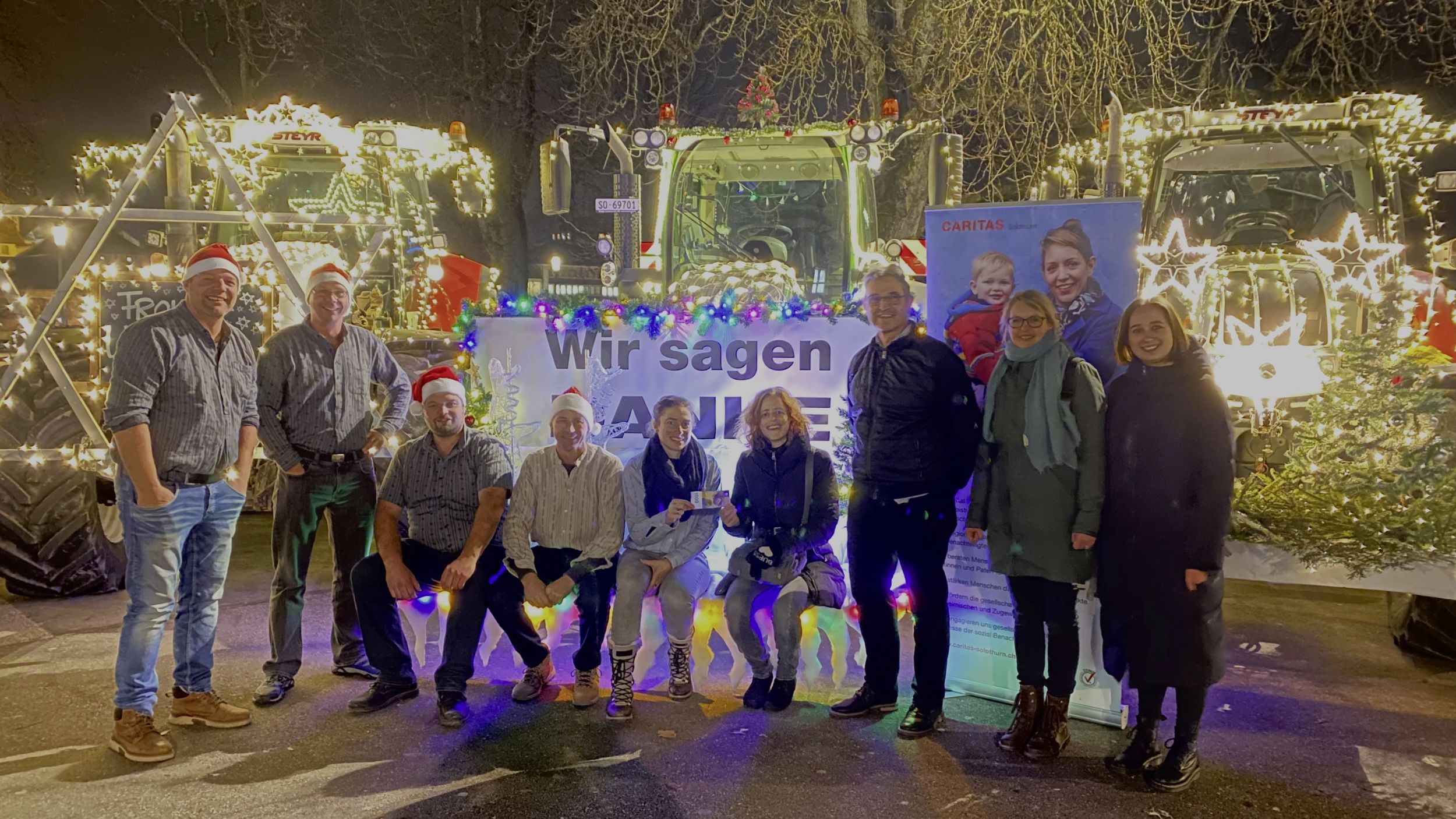 Die Kosten für das Schmücken der Fahrzeuge wurde allein von den Teilnehmenden getragen. Da die Organisatoren ehrenamtlich wirken, bleibt doch noch etwas übrig. Mit drei weihnachtlich geschmückten Traktoren fuhr das OK am Donnerstag nach Solothurn. Dort überreichte dieses der Caritas Solothurn eine Spende von 1000 Franken. Das OK will so den Ärmsten der Gesellschaft helfen.