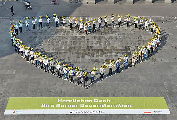 Auf dem Berner Bundesplatz dankten die Berner Bäuerinnen und Bauern am Montag mit einem Herz aus Sonnenblumen für das Vertrauen in ihre Arbeit und Produkte.