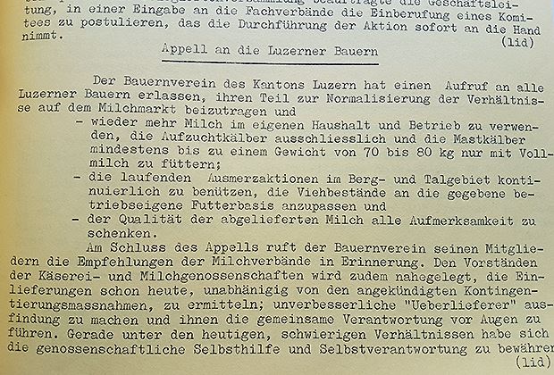 Im Rückblick geht es heute um den Bauernverein Luzern, der sämtliche Bauern dazu aufforderte, ihren Teil zur Normalisierung des Milchmarktes beizutragen. Unter anderem sollten "unverbesserliche Überlieferer" ausfindig gemacht werden.