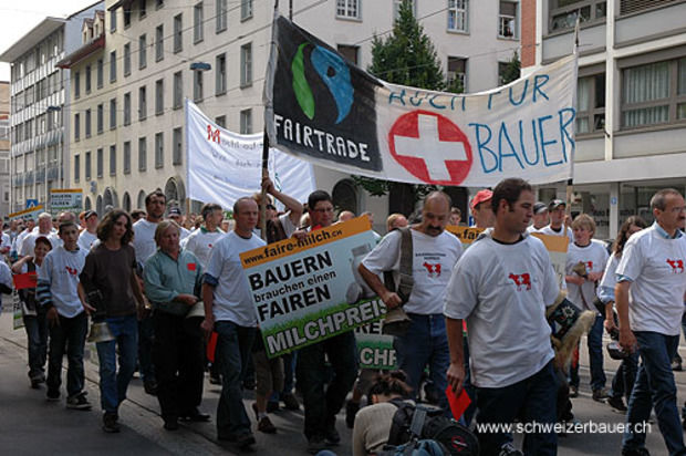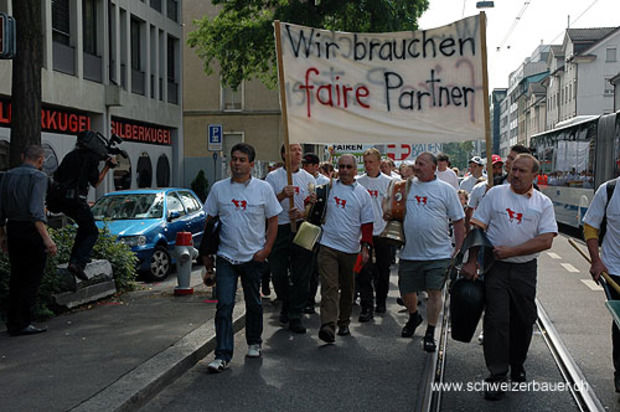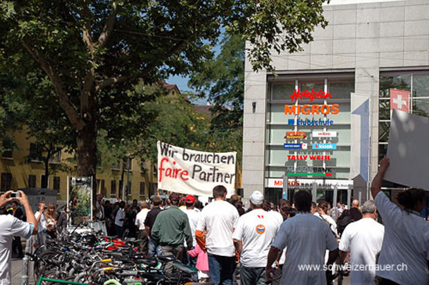 Zahlreiche Bauern demonstrierten am Dienstag Vormittag in Zürich mit einem Alpaufzug vom Hauptbahnhof bis zum Hauptsitz des Migros-Genossenschaftsbunds. Sie fordern, dass sich die Migros ihre Versprechen in der BOM einhält.