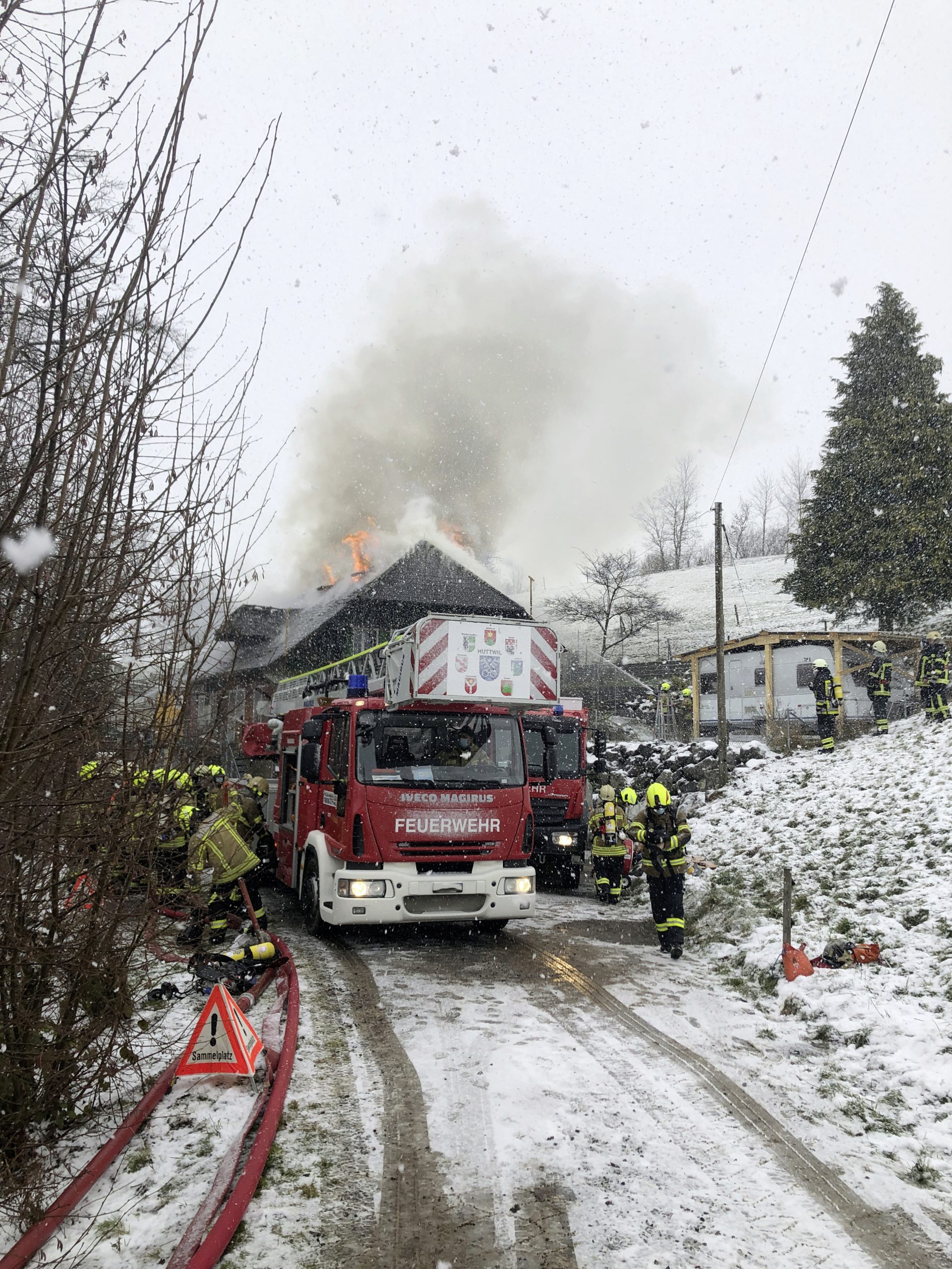 Als die umgehend ausgerückten Einsatzkräfte vor Ort eintrafen, standen Teile des Daches bereits in Brand. Die Angehörigen der Feuerwehr Dürrenroth und der Feuerwehr Region Huttwil nahmen sofort die Löscharbeiten auf.