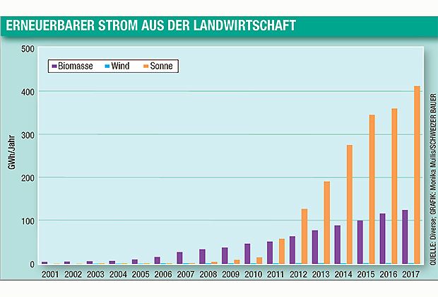 Die landwirtschaftliche Stromproduktion aus Sonnenenergie ist stetig gestiegen, zwischen 2011 und 2017 von etwa 50 GWh/Jahr auf über 400 GWh/Jahr (siehe Grafik). «2016 und 2017 wuchs sie weniger stark als in den Vorjahren, weil viele Bauern wegen der Einmalvergütung verunsichert waren», weiss Gisler. «Für 2019 ist aber wieder eine Zunahme zu erwarten.»