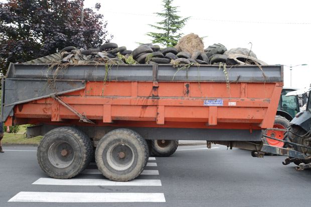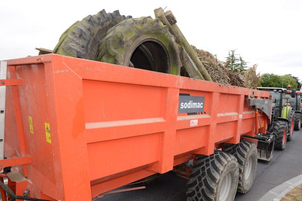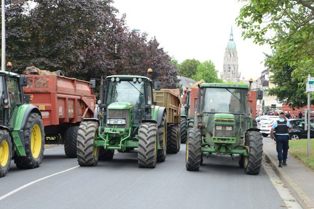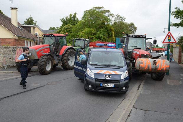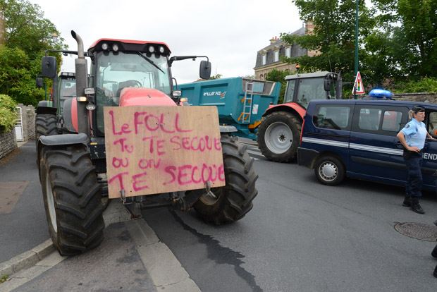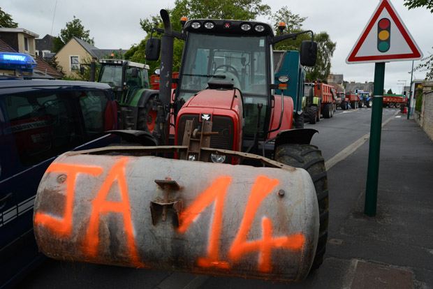 120 Traktoren mit Kippern voller Mist und alten Pneus blockierten am Mittwoch die Strassen des Städtchens Bayeux in der Normandie. Nach einem Katz-und-Maus-Spiel mit der Polizei endet der Umzug vor dem Ehrenmal für die gefallenen Soldaten in der Nähe der Präfektur.