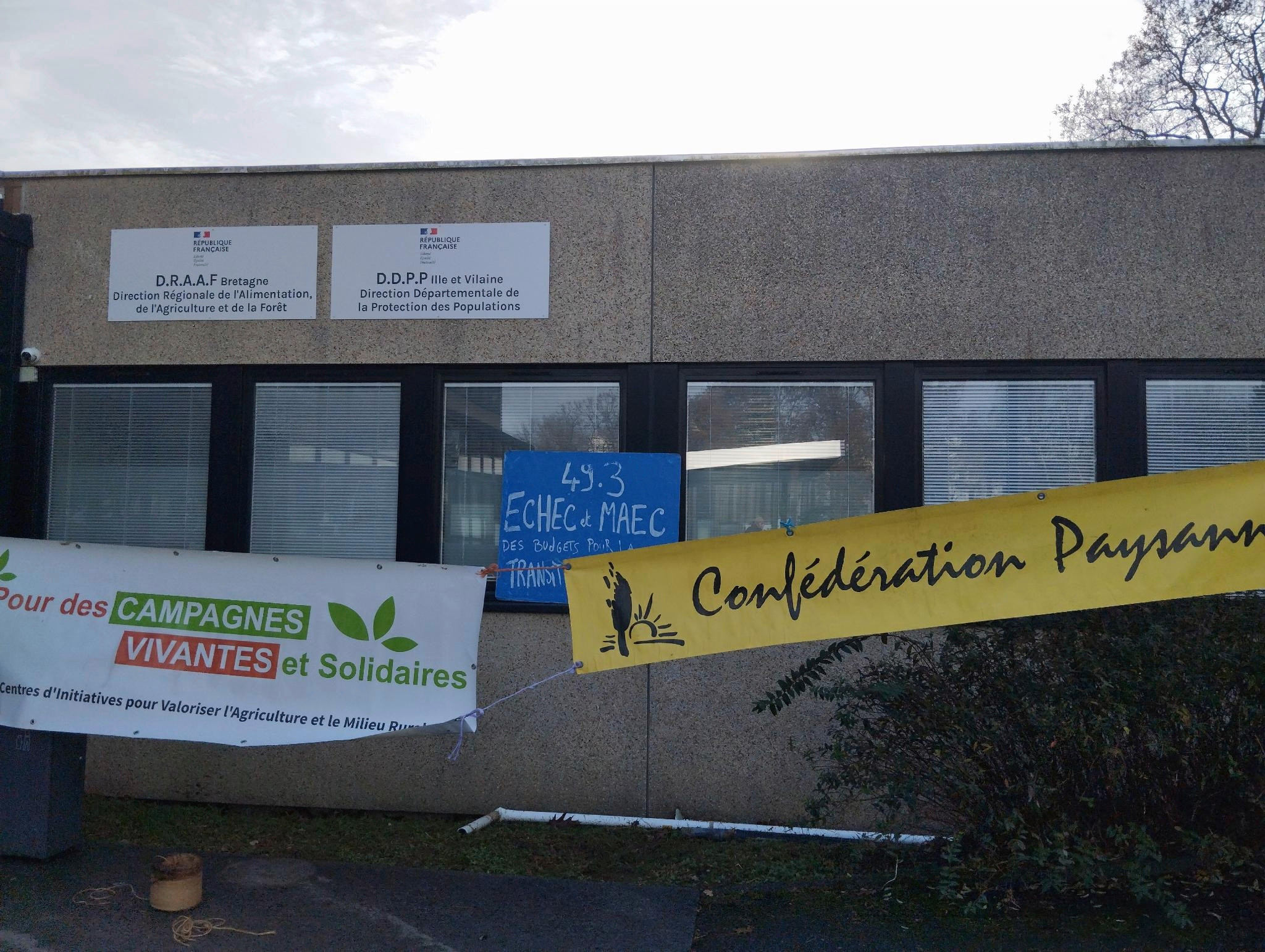 Anfang Dezember hatten mehr als 100 Landwirte die regionale Aussenstelle (DRAAF) des Landwirtschaftsministeriums in Rennes besetzt. Auch vor der Nationalversammlung in Paris wurde demonstriert. Mit den Aktionen hatten kleinere Verbände wie der kleinbäuerlich orientierte Confédération Paysanne (Conf‘) und der Verband der Familienbetriebe (MODEF) auf eine Lücke bei der Finanzierung der MAEC aufmerksam gemacht und gefordert, dass der Staat seine Versprechen hinsichtlich der Förderung von nachhaltigeren Bewirtschaftungspraktiken einlöst.