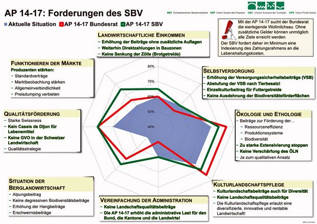 Im Bereich «Landwirtschaftliche Einkommen» forderte der SBV eine Erhöhung der Beiträge ohne zusätzliche Auflagen, weiterhin Direktzahlungen in Bauzonen und keine Senkung der Zölle, namentlich beim Brotgetreide. Die erste Forderung ist klar nicht erfüllt, sondern im Gegenteil muss für gleich viele Direktzahlungen wie bisher mehr Aufwand betrieben werden. Für die schon eingezonten Bauzonen gibt es zwar noch Direktzahlungen, nicht jedoch für Flächen, die ab 1.1.2014 neu in die Bauzone gelangen. Und die Festlegung der Zölle obliegt weiterhin dem Bundesrat.