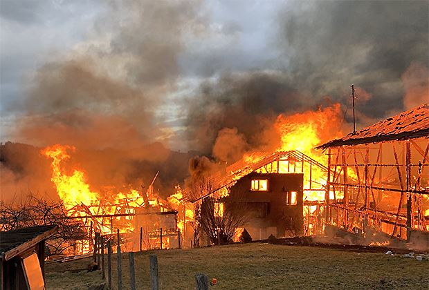 Bei Bauma ZH sind am Montagmorgen fünf Gebäude niedergebrannt. Es handelt sich hierbei um einen Stall und Agrargebäude. Das Grossvieh konnte gerettet werden, Hühner starben in den Flammen. -> Mit Video