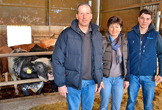 Schlatters kaufen nur AA-Tränker zu. Qualität lohne sich, so habe man 2013 einen durchschnittlichen Tageszuwachs von 1360g, ein Schlachtgewicht von 296kg sowie grösstenteils C- und H-Klassierungen erzielen können. Die Tränker werden mit 72kg eingestallt. «Die Aufzuchtration besteht aus Heu, etwas Mais zur Angewöhnung, Kälbermilch und Kraftfutter. «Kraftfutter und Milch gibts ab einem Automaten», nannte Schlatter eine Besonderheit, «Kälber, die viel fressen, erhalten weniger Milch.»