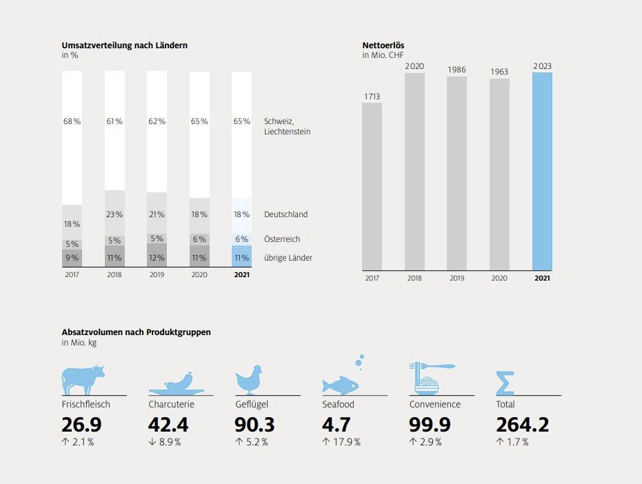 Der Geschäftsbereich Bell Schweiz, der 51 Prozent zum Warenumsatz beisteuert, machte ein Plus von 3,1% auf 1,05 Mrd. Fr. Dabei konnte Bell im Detailhandel mehr verkaufen, weil die Menschen wegen der Homeoffice-Pflicht häufiger zu Hause gekocht haben. Ausserdem war der Einkaufstourismus eingeschränkt. Hauptverantwortlich für die positive Entwicklung sei das «starke Kerngeschäft» mit Fleisch im Schweizer Detailhandel, erklärte Bell-CEO Lorenz Wyss. Das Absatzvolumen betrug 63.6 Millionen Kilogramm und lag damit um 0.9 Millionen Kilogramm (+1.5%) über der Vorjahresperiode.