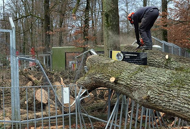 Rund 20 Bäume sind auf die Gehege der Wisente, Wölfe und Bären gefallen und haben zu grossen Schäden geführt. Kurz nach dem Durchzug des Sturms wurden sogleich die Reparaturarbeiten in Angriff genommen. Diese dauern noch an. Im Wolfsgehege konnten bis am Donnerstag aber erst fünf von sechs Wölfen gesichtet werden. Dennoch beruhigt Tierpark-Direktor Bernd Schildger gegenüber Radio SRF: «Wölfe sind Rudeltiere. Wir gehen nicht davon aus, dass er aus dem Gehege ausgebrochen ist.»