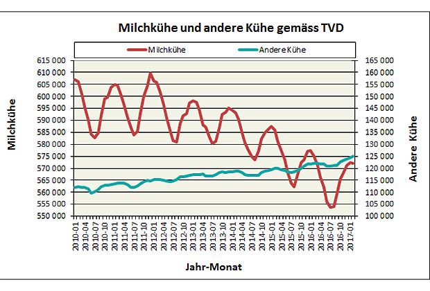 Der Rückgang des Milchviehbestandes hat sich so stark verlangsamt, dass er aktuell durch die Zunahme des Mutterkuhbestandes beinahe kompensiert wird. Der Bestand der Milchkühe nahm innert Jahresfrist um 3084 Milchkühe ab. Die Anzahl der Milchkühe im Alter von zwei bis drei Jahren ist gegenüber dem Vorjahr um 3867 Kühe bzw. um 5,4 Prozent angestiegen. Da man von einer Steigerung der Produktivität ausgehen müsse, könnte dies bedeuten, dass die Milchproduktion eher wieder ansteigen werde, so Agristat.