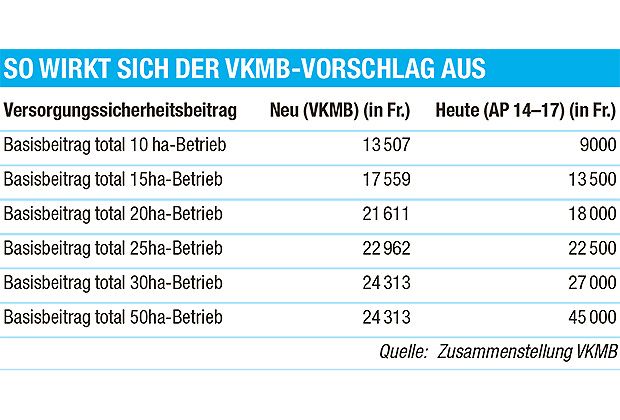 Heute werden als Basisbeitrag Versorgungssicherheit 900 Fr./ha bis zur 60. Hektare bezahlt. Die VKMB möchte für die ersten 10 Hektaren 1351 Fr./ha bezahlen, für die Hektaren 11–20 810 Fr./ha und für die Hektaren 21–30 nur noch 270 Fr./ha. Für die 31. und für alle weiteren Hektaren soll ein Bauernbetrieb laut der VKMB keine Beiträge für Versorgungssicherheit mehr erhalten. sal