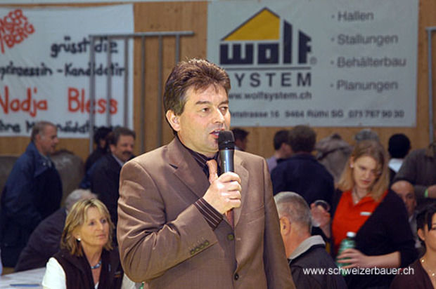 Ob da wohl einer kein Hotelzimmer mehr gefunden hat? Abteilung 10 "is sponsered by Schweizer Bauer"... Gut gegrinst ist halb gelacht... Nach der Ausstellung wird noch das Tanzbein geschwungen. "Schweizer Bauer" Verlagsleiter Ueli Utiger mit IGBS-Präsident Ruedi Bachofen. Was erzählt wohl Martin Haab hier Annette Geser? Markus Zemp und Martin Haab haben das Heu (milch)-politisch nicht immer auf der gleichen Bühne. Aber Braunvieh haben beide gern. Das Euter von Wurl Dorli. Verlagsleiter Ueli Utiger ist Hahn im Korb bei der Ehrung von Abteilung 10 mit der Siegerin Zoldo Prisma. Die Ehrung der Schausieger des Jahres 2008. Richter Markus Mock im Element. Das Publikum verfolgt gespannt die Schau. Emil Zwingli ist nicht nur Organisator der Betriebsmeisterschaft, er nimmt auch selber an der Ausstellung teil. Nicht nur braune, auch blonde Schönheiten tummeln sich im Ring... Margrit Zwingli verteilt die Ehrenpreise. Die Nummerngirls sind die Finalistinnen im Kampf um den Titel einer Milchprinzessin. Richter Markus Mock freut sich auf seinen Einsatz. Der noch volle Gabentempel. Die Vorbereitungen für die Schau sind im vollem Gange... Auch im Tierzelt ist viel los. Ringman Daniel Gasser und Ehrendame Annette Geser. Martin Haab, der oberste Milchstreiker der Nation, moderiert. Es geht los. I mah nümm, i ha gnue... Sind das etwa Zwingli Emils Töchter? Nein, es handelt sich um die bekannte Schautruppe "The Twins".