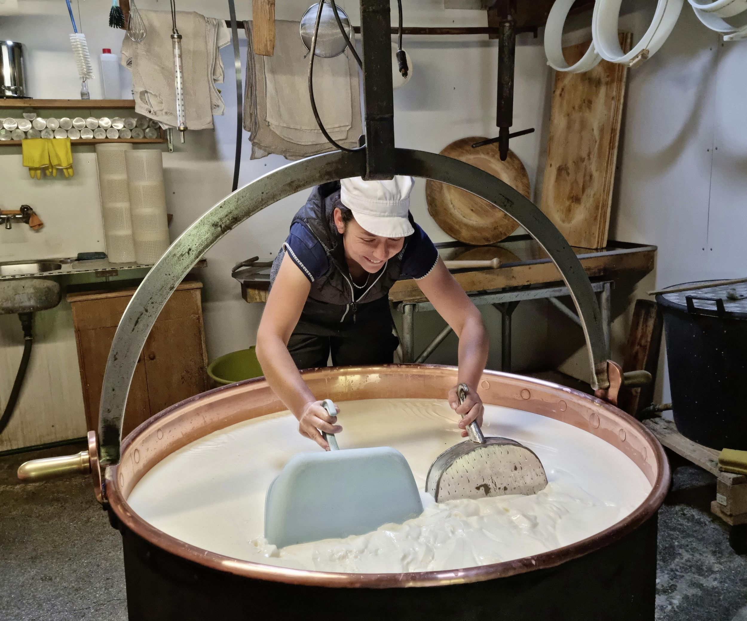 Nach dem Ausrühren holen wir den Käse mit dem «Bögli» und dem Käsetuch aus dem Chessi. Erst kühle ich meine Arme mit kaltem Wasser, bevor ich bis zu den Oberarmen in die dampfende Käsemilch eintauche. Dabei halte ich immer den Atem an. Wieso, weiss ich nicht. Doch es hilft, die heisse Temperatur auszuhalten. Sind Renate, Hansruedi und ich zusammen am Käsen, hat jeder seine Aufgaben und kennt seine Handgriffe.
