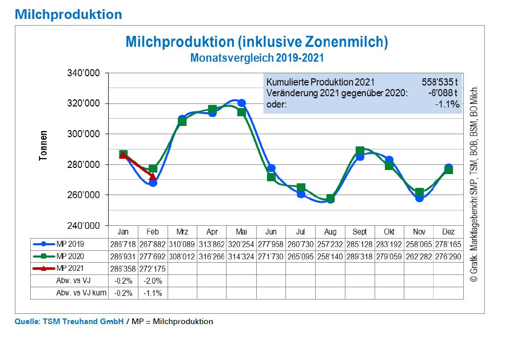 Die kumulierte Produktion der Monate April und Februar betrug 558‘535 Tonnen. Das sind 6‘088 Tonnen oder 1.1 Prozent weniger als im Vorjahr. Zu beachten gilt es aber, dass der Februar 2020 schaltjahrbedingt einen Tag mehr hatte.