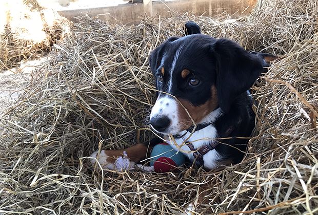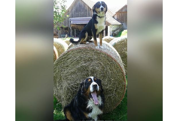 Der Hund auf der Heuballe heisst Jacky und der Bernersenne heisst Baschi.
