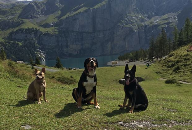 Safira,Bond und Jana sitzen vor dem schönen Oeschinensee im Berner Oberland.