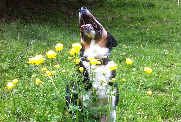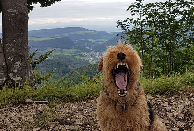Die müde Dasty gähnt nach einer wunderbaren Wanderung auf der Wasserfallen.