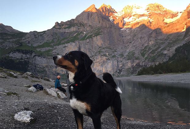 Finn setzt sich vor dem Oeschinensee oberhalb Kandersteg BE in Pose.