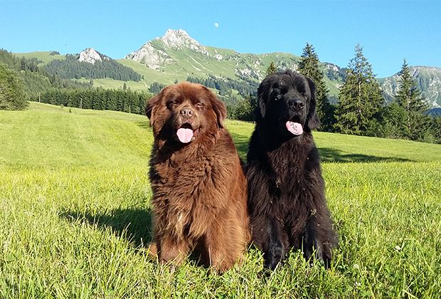 Die braune Neufundländer Hündin Luana ist 8-jährig. Der schwarze Rüde George ist erst 10 Monate jung. Beide posieren auf der Alp Muscherli.