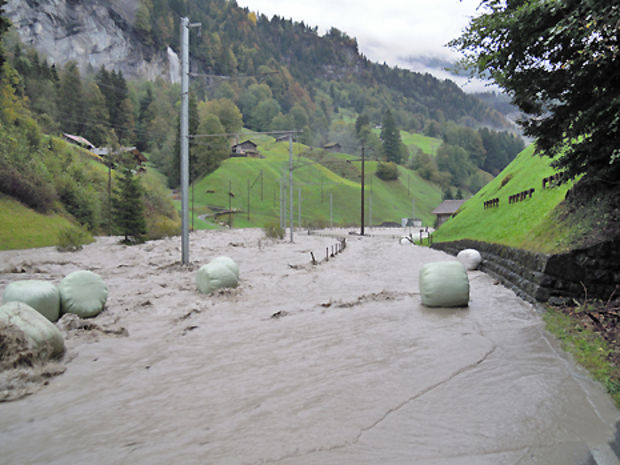 Das Wasser der wild gewordenen Kander bahnte sich am Montag einen Weg durch den Lawinenschutztunnel Mitholz und riss Teile des Strassenbelags mit sich. Schliesslich lief das Wasser zu einem See zusammen. Die Gebäude in dieser Region seien bis zum ersten Stock voller Schlamm und Wasser, berichtet Walter Lüthi auf Anfrage.