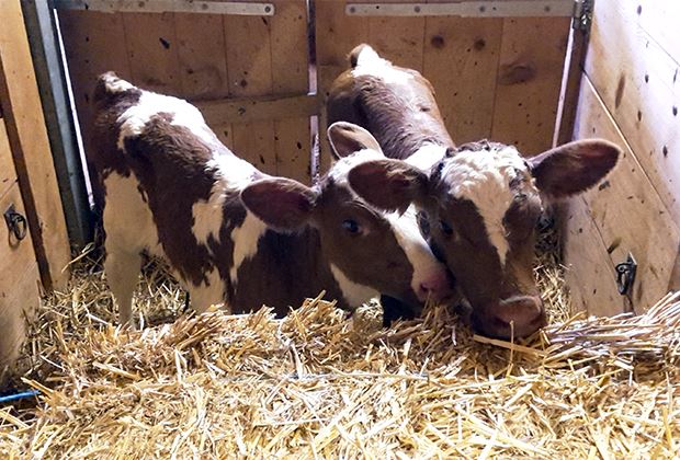 Priska ist eine Kreuzung Braunvieh x Limousin. Ihre Freundin Panama ist unverkennbar ein Holstein-Kuhkalb. Beide sind kurz vor Weihnachten, am 23.12.2017 geboren.