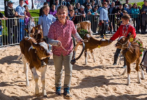 Die Kinder führen die Kälber an der Viehschau in Gondiswil BE.