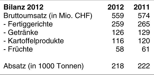 Vom gesamten Umsatz wurden 259 Millionen Franken (-6 Mio. gegenüber 2011) mit Fertiggerichten erzielt. 126 Millionen Franken (-3 Mio.) erwirtschaftete das Unternehmen mit Getränken, 116 Millionen Franken (-4 Mio.) mit Kartoffelprodukten und 58 Millionen Franken (-3 Mio.) mit Früchten.