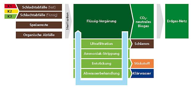 Die Biorender-Technologie unterscheide sich gegenüber konventionellen Biogasanlagen dadurch, dass der Gärprozess in den drei Fermentern mit einem Volumen von je 1‘200 m3 unter kontrollierten Bedingungen abläuft, heisst es weiter. Insbesondere der Ammoniakgehalt muss zum Schutz der Methanbakterien begrenzt und kontinuierlich überwacht werden können, wird auf der Website festgehalten. Die Biogasanlage ist auf die Entsorgung von fleischhaltigen Abfällen mit hohem Eiweiss- und Fettgehalt ausgelegt. Der Kanton Thurgau hiess eine Verwertung mit 30‘000 Jahrestonnen gut.
