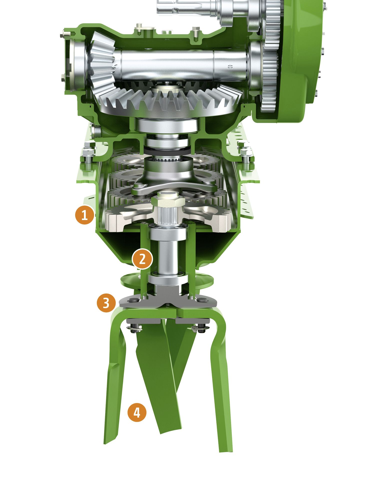 Das Getriebe befindet sich jeweils auf den beiden seitlichen Auslegern. Die Kreiselegge kann mit der Zapfwellen-Drehzahl 1’000 eingesetzt werden. Über Wechsel-Zahnradsätze ist die Anpassung der Werkzeugträger-Drehzahl an unterschiedliche Bodenverhältnisse möglich.