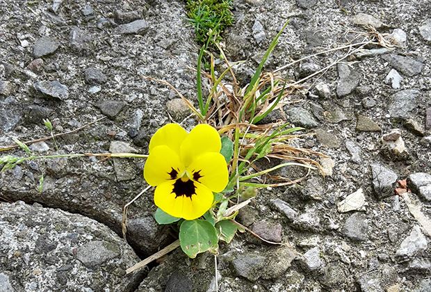 Ein Stiefmütterchen hat es durch den Asphalt geschafft.