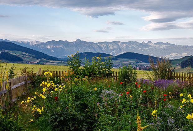 Das Siegerbild wurde auf dem Möschberg im Oberthal BE aufgenommen. Niklaus Hofer ergänzte seine Einsendung folgendermassen: "was will man mehr, einen solchen Blumengarten mit herrlicher Aussicht auf die Stockhornkette." Wir sind der gleichen Meinung. Herzlichen Glückwunsch!
