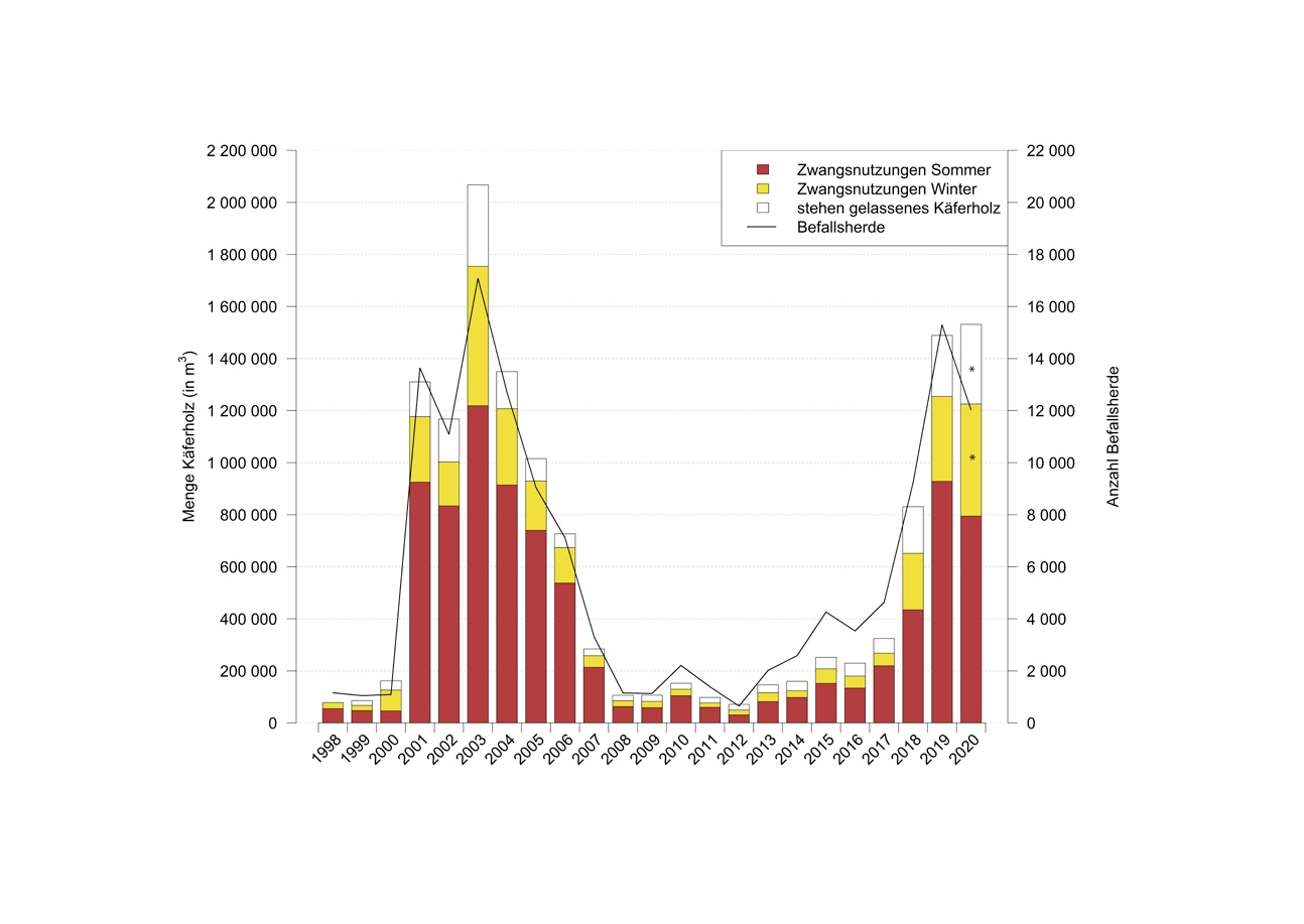 Schätzungen für den Winter zeigen jedoch, dass die Menge an befallenem Holz auf mehr als 1,5 Millionen Kubikmeter ansteigen könnte. Das entspräche einem Rekord seit 2003. Die tatsächlichen Werte werden im Herbst 2021 erhoben.