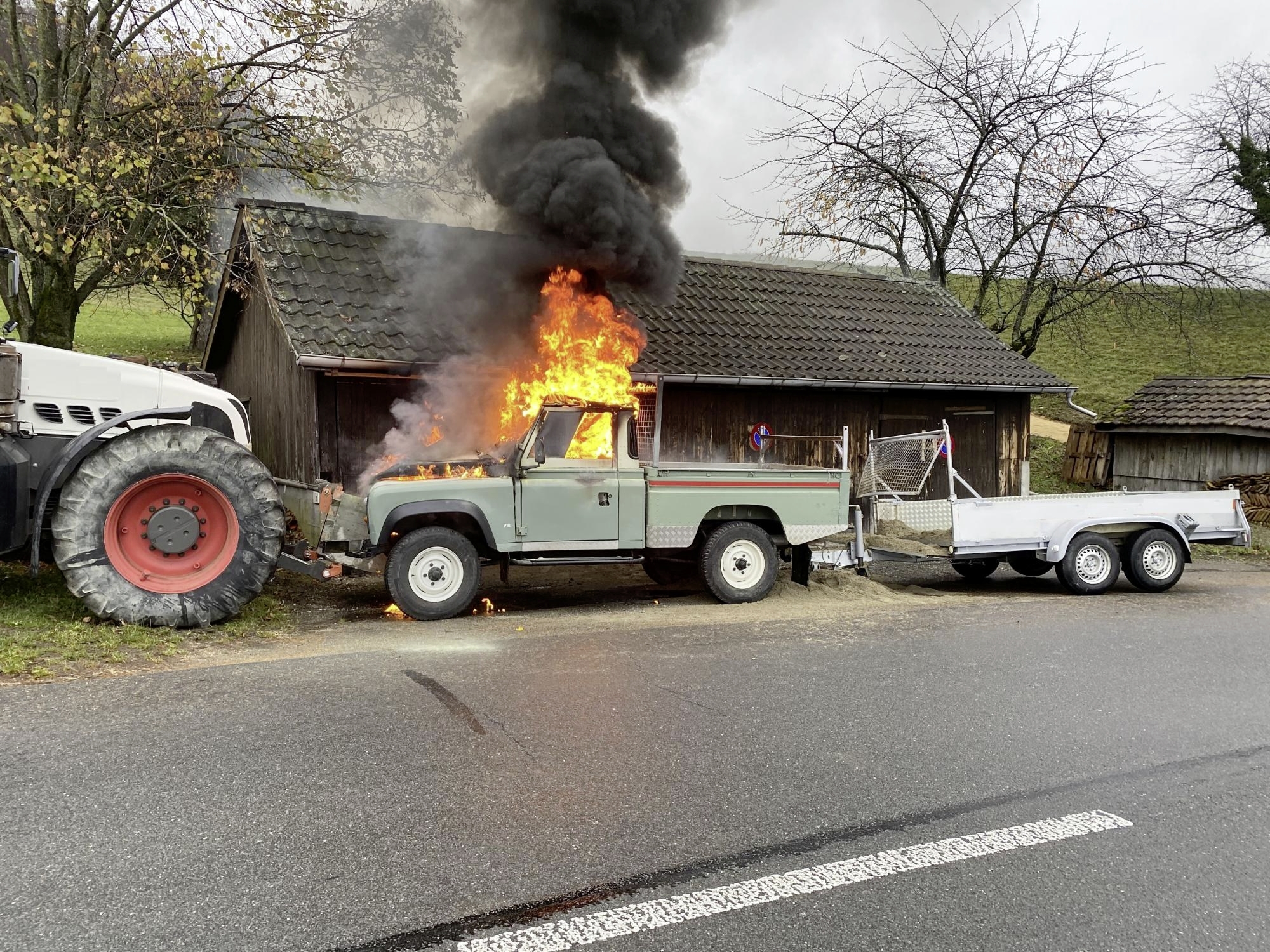 Das Auto kollidierte anschliessend frontal mit einem parkierten Traktor. Der Wagen geriet in der Folge in Brand.