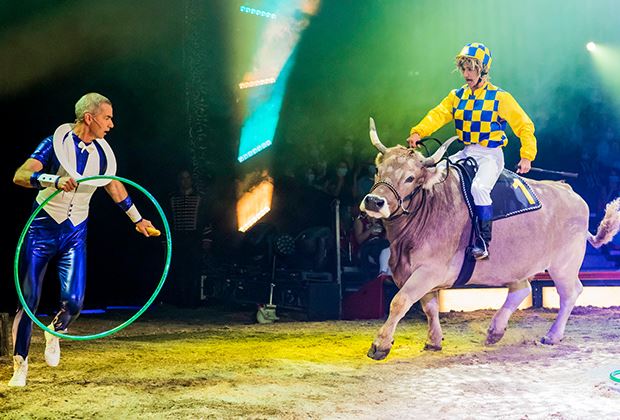 Ursus und Nadeschkin treten im Circus Knie mit Circe auf. Mit Brot bringen die Komiker die Kuh in Bewegung.