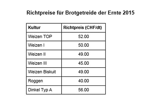 Einig waren sich die Akteure, dass die Anbaubereitschaft der Bauern aufrechterhalten werden müsse. Mit dem Beibehalten der Richtpreise bekenne sich die gesamte Wertschöpfungskette zur einheimischen Produktion und Verarbeitung von Brotgetreide, heisst es weiter. Am 26. Juni konnte einigte sich die Kommission auf folgende Richtpreise: Weizen der Klasse TOP 52.- je dt, für Klasse I 50.-/dt, für Klasse II 49.-/dt und für Weizen der Klasse III 45.-/dt. Der Ernterichtpreis für Biskuitweizen beträgt 49.-/dt, für Roggen 40.-/dt und für Dinkel 56.-/dt.
