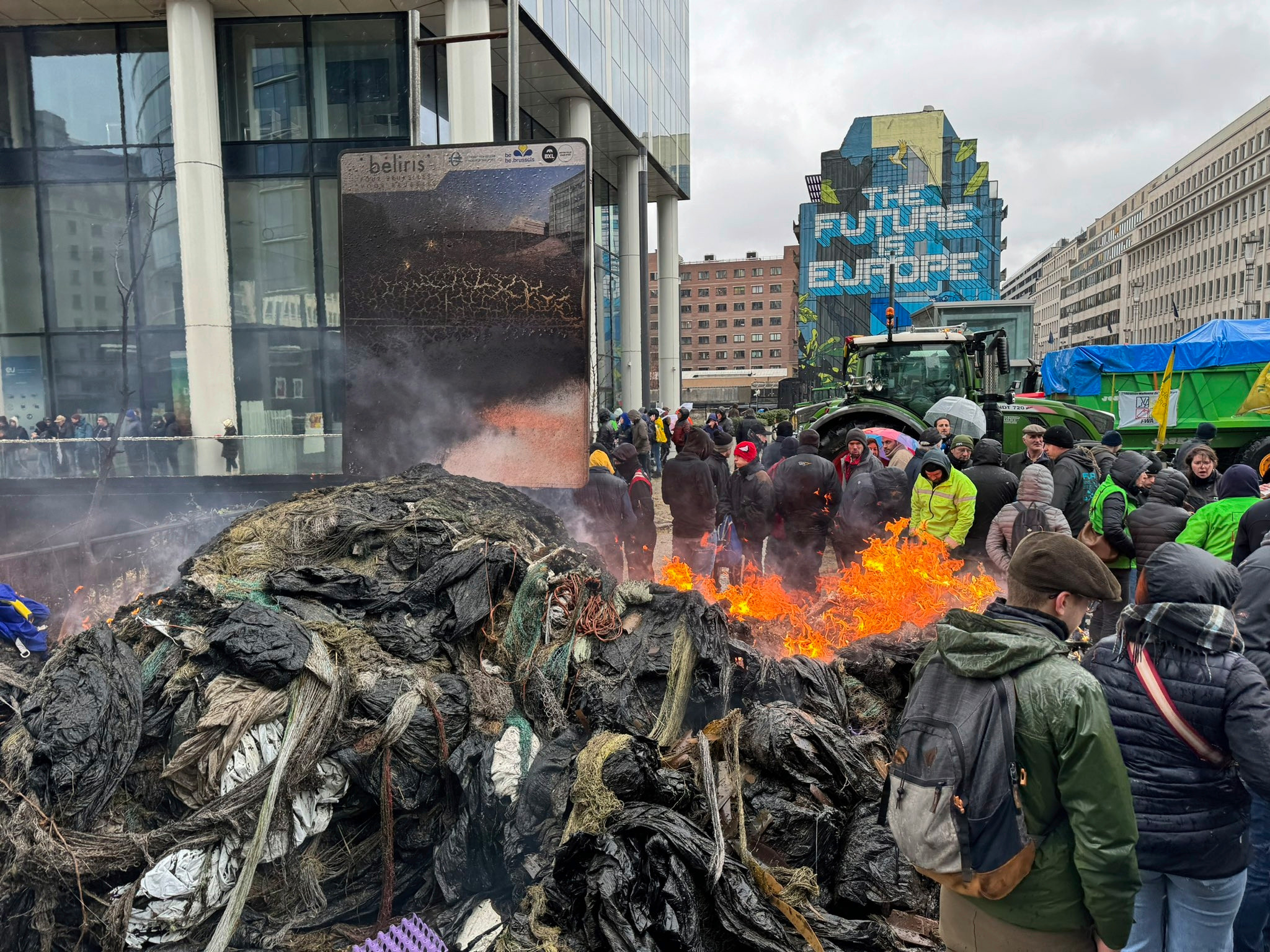 Demonstrators lit fires and shot grain onto the streets during the latest farmers' protest in the Belgian capital. Police responded with water cannons.