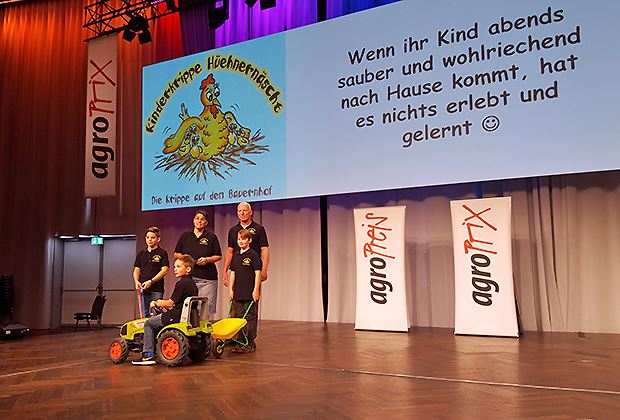 15.51 Uhr: Nun präsentieren sich die Nominerten in einer vierminütigen Darbietung. Den Anfang macht die Bauernhof-Kindertagesstätte von Sandra Schmid Koch aus Uezwil AG. In einem Video bringen sie ihr Projekt näher. In einem hervorragendem Film zeigen sie ihren Hof. Der Betrieb benötigte einen zweites Standbein. Dieses fanden sie in einer Kita. Fünf Personen betreuen rund 12 Kinder. Die Kinder gehen auch auf den Hof und helfen mit. So erleben sie die Tiere und die Landwirtschaft hautnah. "Die Kinder sind unsere Konsumenten der Zukunft", so Sandra Schmid Koch. Es lohne sich deshalb, den Kindern die Landwirtschaft näher zu bringen. Sie bringen den Kindern auch bei, dass man Lebensmittel nicht verschwendet und dass Tiere geschlachtet werden müssen, um Fleisch essen zu können. Ein Drittel des Betriebseinkommen wird heute über die Kita generiert.