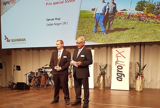 15.15 Uhr: Spezialpreis des Schweizerischen Landmaschinen-Verbandes (SLV). Bendicht Hauswirth, Jurymitglied des SLV, erklärt, der Verband vertritt rund 200 Mitglieder. 2017 wurden 12 Projekte eingereicht. Es werden Neuheiten und Weiterentwicklungen ausgezeichnet., die sich in der Praxis bewähren. 2017 wurden ein Projekt im Futterbau in Hanglagen ausgezeichnet. Ein selbstgebauter Kreiselheuer zum Wenden des Futters machte das Rennen. Aus einer Idee wurde eine fertige Maschine. Die Maschine hat eine Breite von 8 Meter. Zwei Kuhn-Kreiselheuer von 4 Meter breite wurden zusammengebaut. Der hydraulische Klappmechanismus zeichnet die Maschine aus. Dies erhöht die Schlagkraft mit dem bestehenden Traktor. Erfinder der Maschine ist Simon Hugi aus Zimmerwald BE. Er wird mit dem Spezialpreis von 5000 Franken ausgezeichnet. «Die Idee war es, mit den vorhandenen Ressourcen effizient Futterbau zu betreiben», so Simon Hugi. Die Leistung des Traktors werde optimal ausgenützt. Die Maschine eigne sich optimal für den Hang. Der gelernte Baumaschinenmechaniker konnte sein Wissen einbringen. Er dankt seinem Vater, der sehr viel zum Bau des Kreiselheuers beigetragen hat.