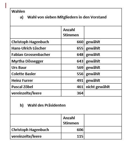 Neben Hagenbuch wurden mit Myrtha Dössegger, Hans-Ulrich Lüscher und Fabian Grossenbacher alle wieder angetretenen Vorstandsmitglieder wiedergewählt. Neu in den Vorstand gewählt wurden Colette Basler, Urs Baur und Heinz Furrer. Mit nur 30 Stimmen Rückstand ist Pascal Zöbel nicht gewählt, das Zurzibiet ist somit im Vorstand nicht vertreten.